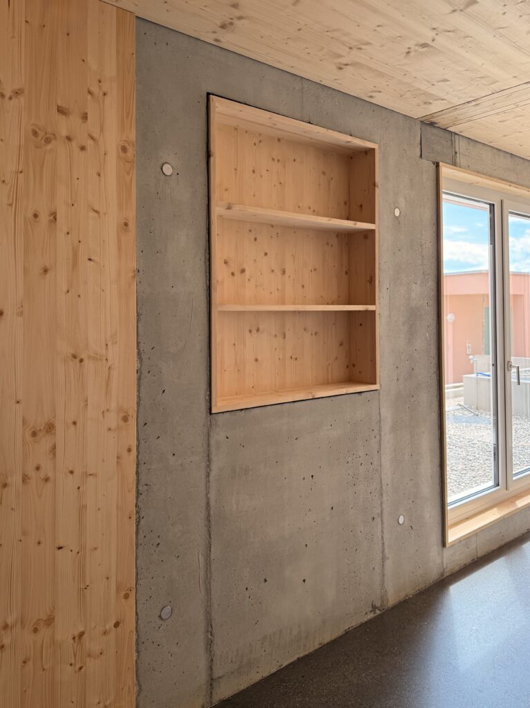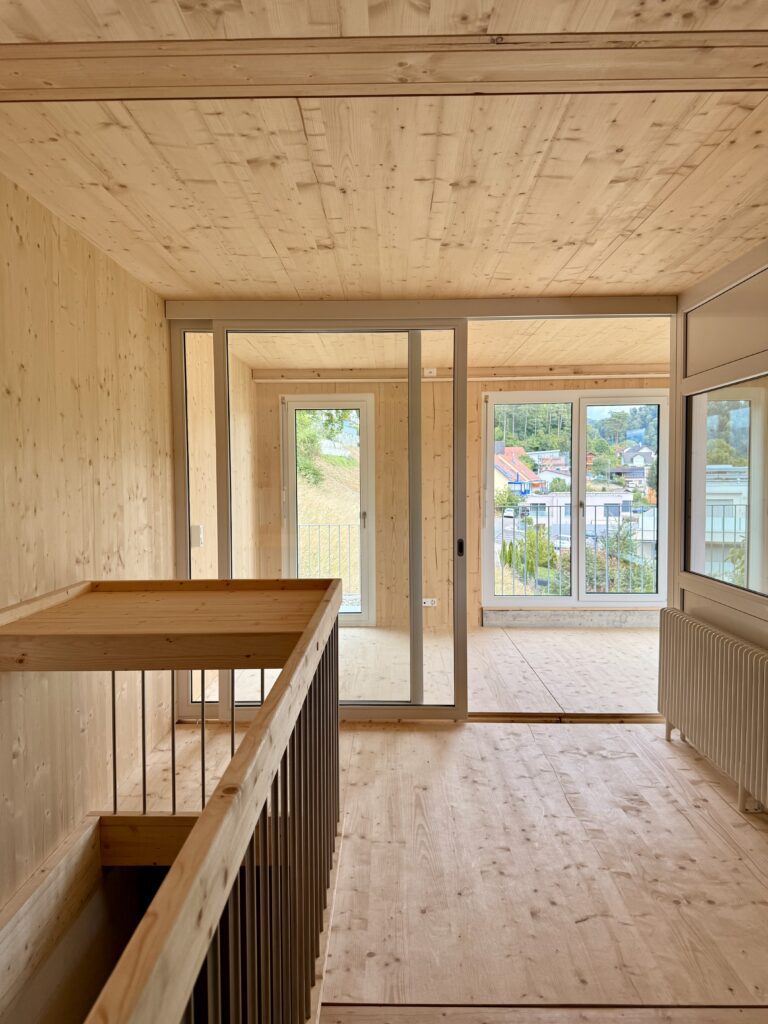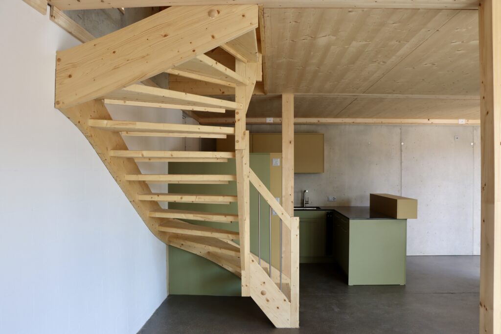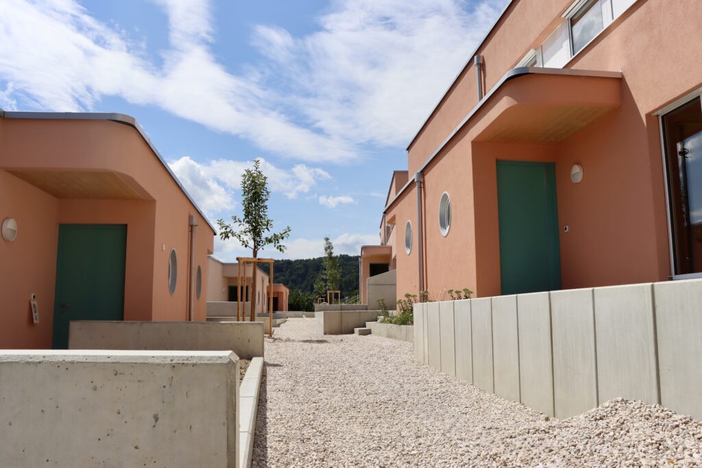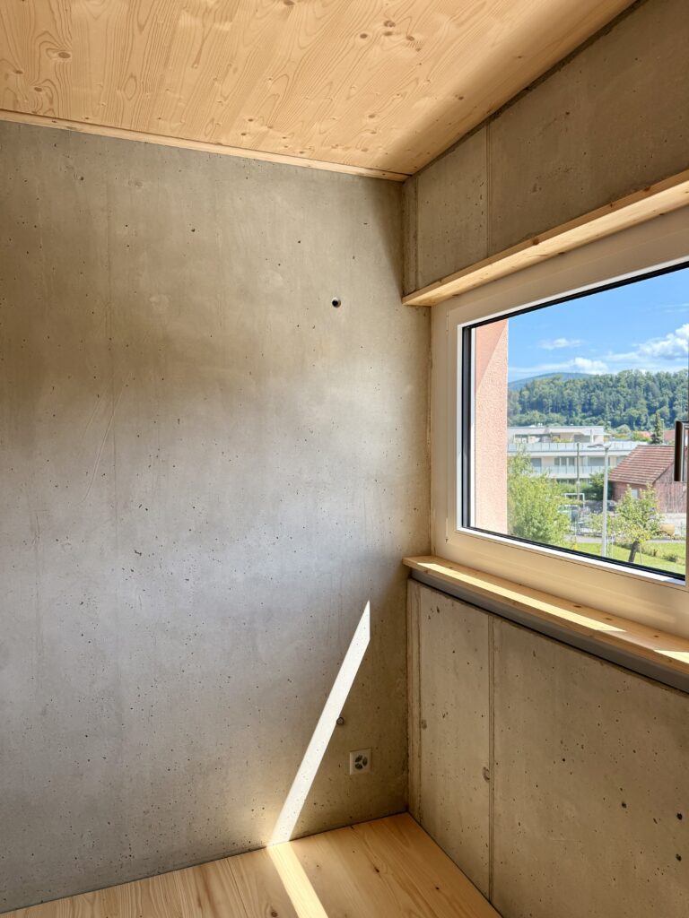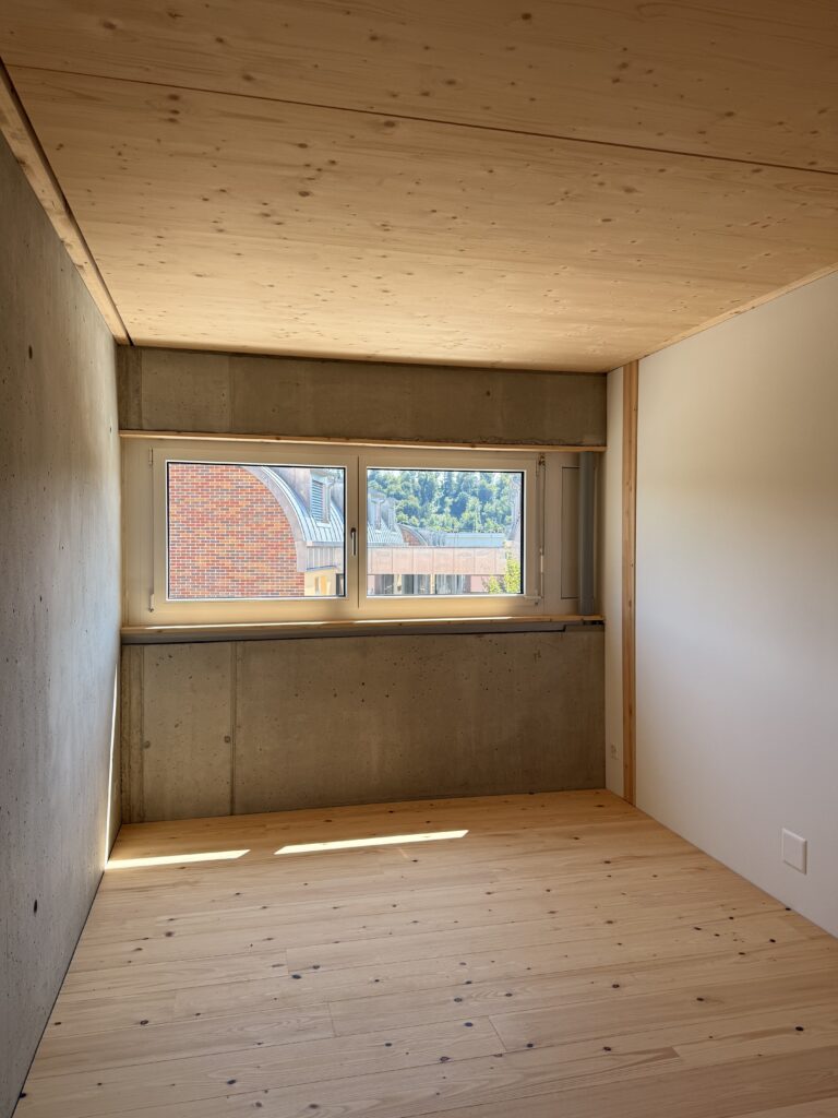 Il concept architettonico si basa su una combinazione equilibrata di legno e calcestruzzo, che risulta allo stesso tempo elegante e funzionale. Le abitazioni su due livelli offrono uno spazio abitativo confortevole per famiglie di quattro persone e favoriscono la creazione di un piacevole ambiente comunitario.